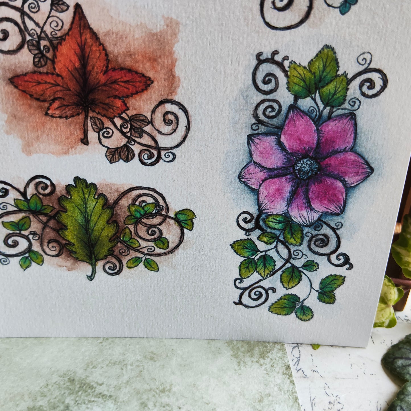 Un assemblage raffiné de champignons, fleurs et arabesques, le tout souligné à l’encre fine et coloré à l’aquarelle. Un format décoratif et poétique qui allie nature et élégance.