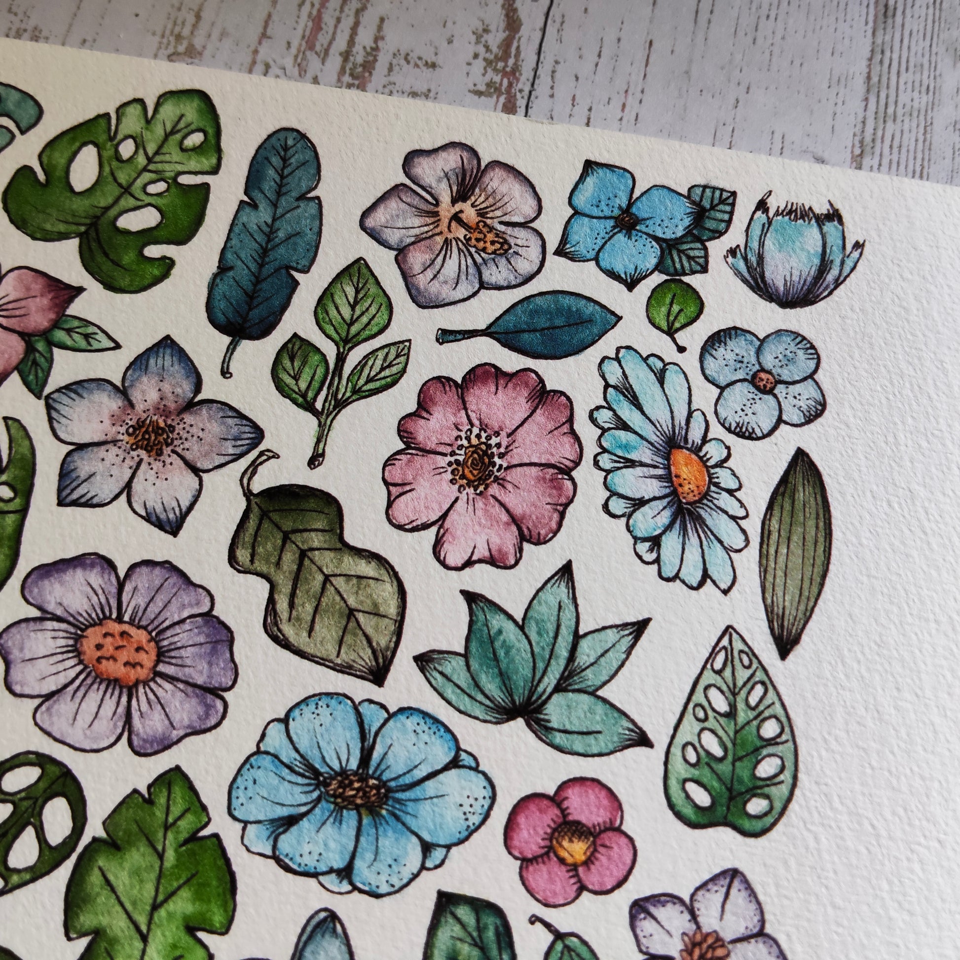 Affiche Aquarelle "Petits Feuillages et Fleurs" - Illustration Nature Ornementale