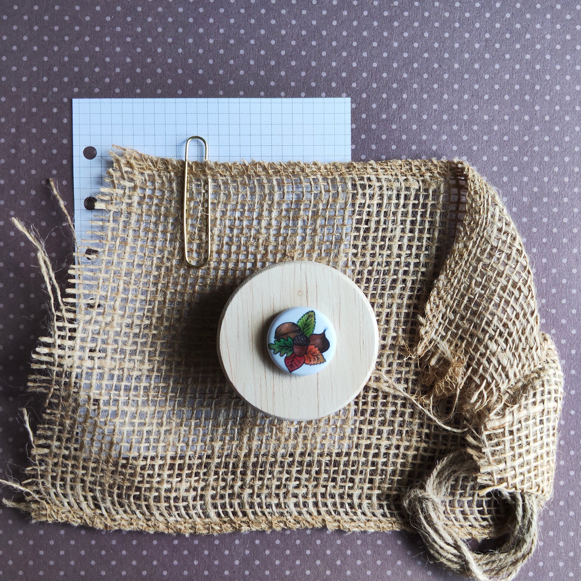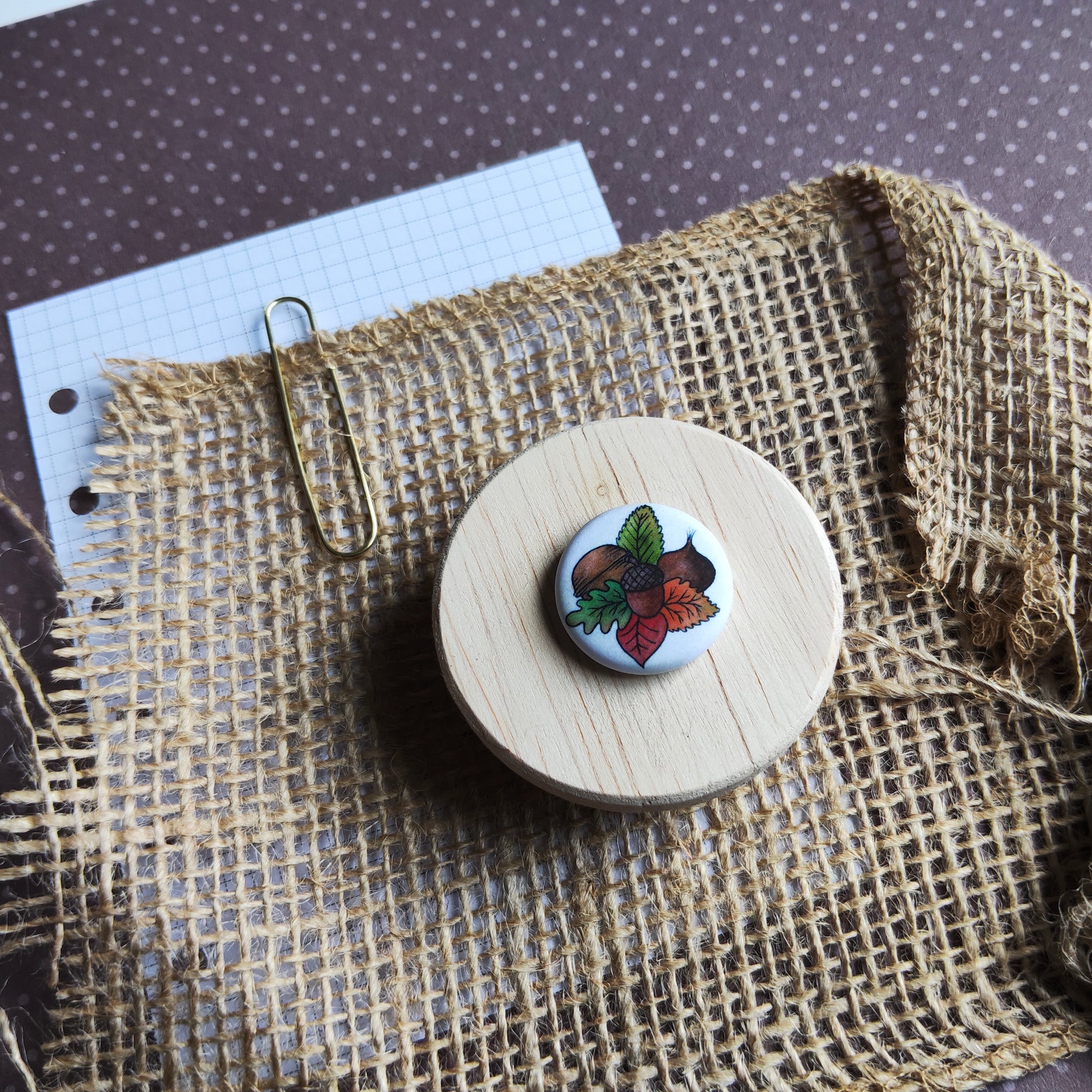 Badge motif de gland, noix et marron. Saison Automne