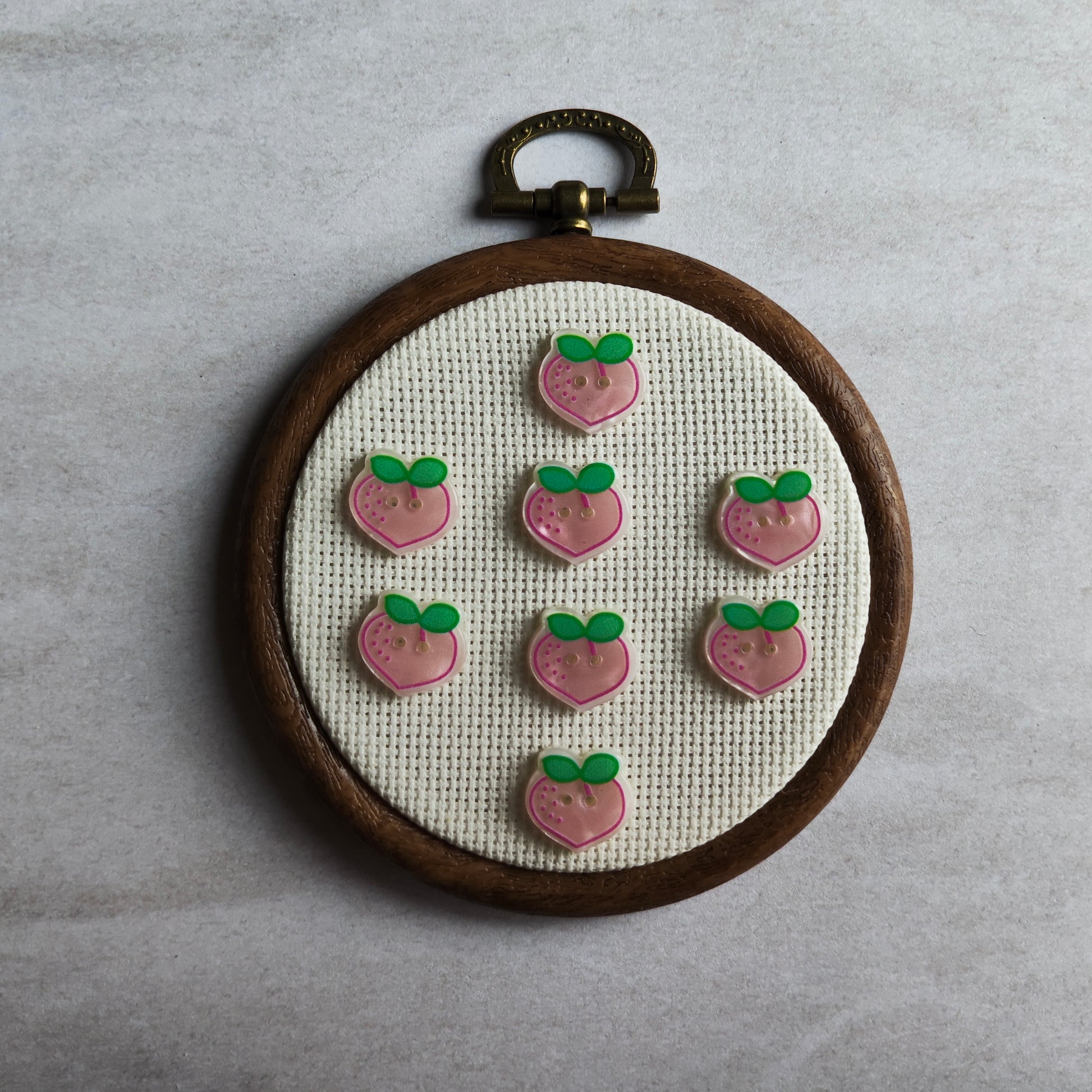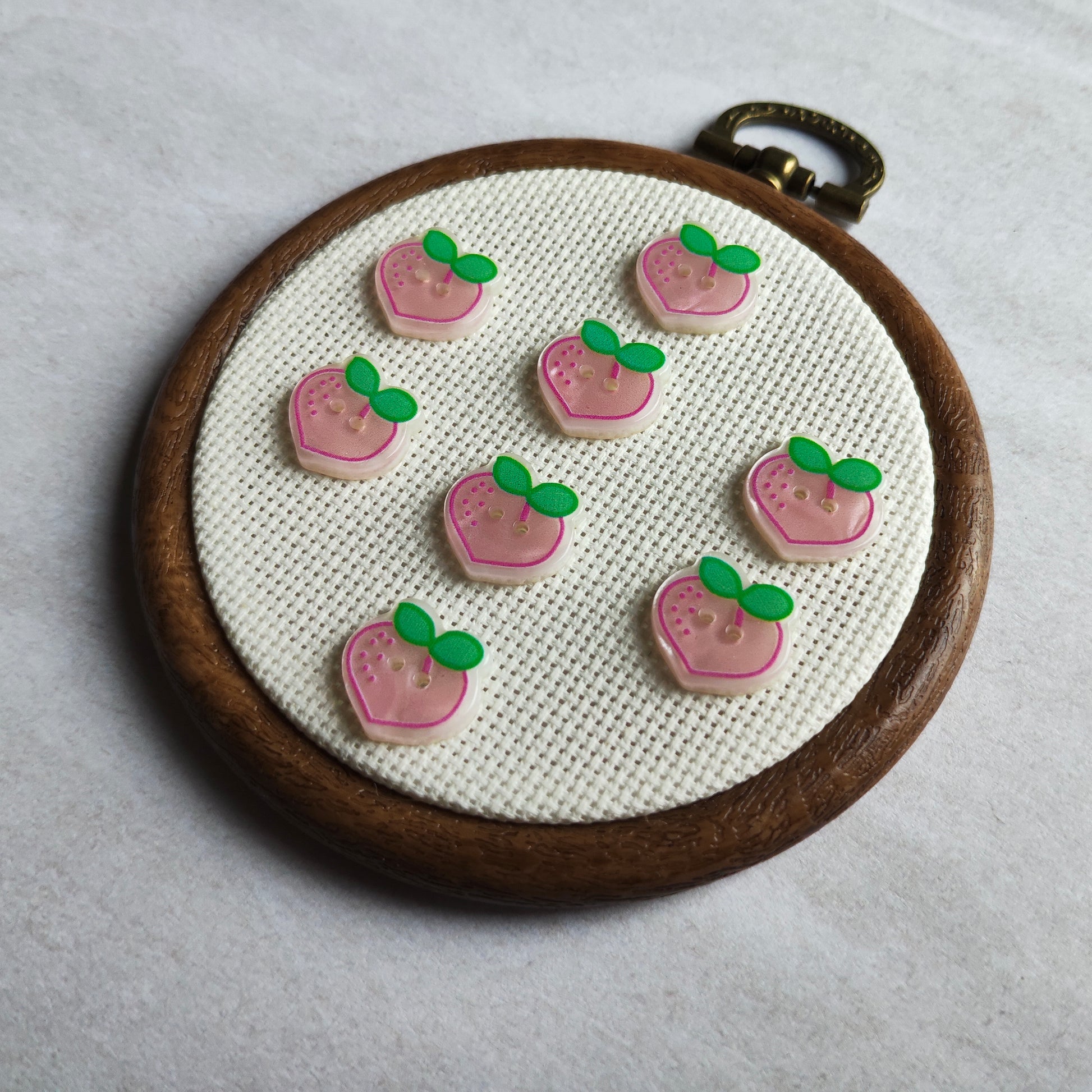 Boutons fruit pêche, couleur rose et vert.