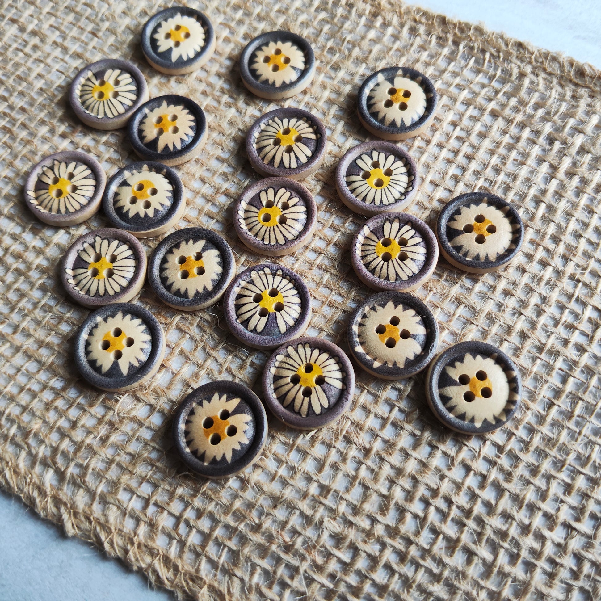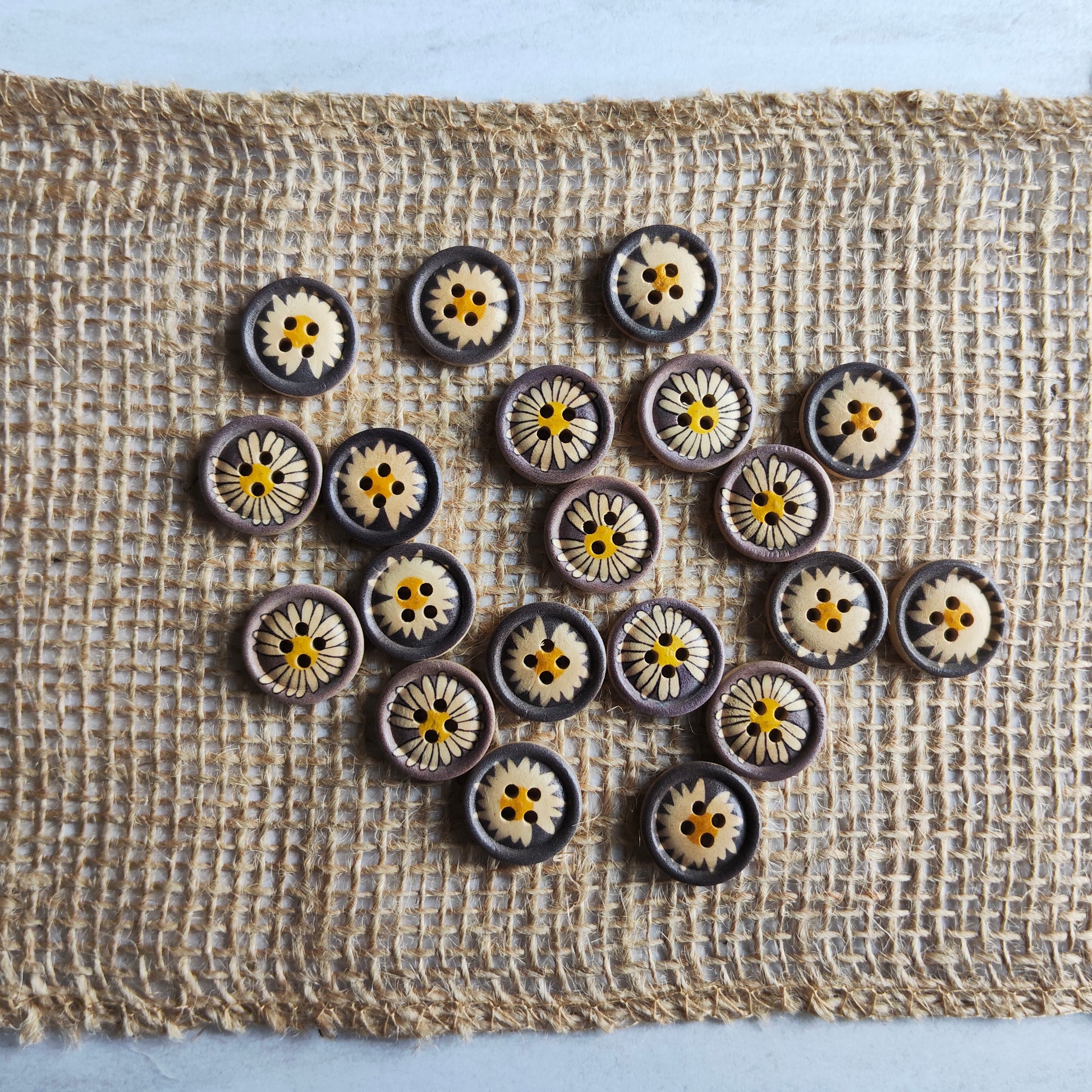 Boutons rond marron fleur marguerite centre jaune bois