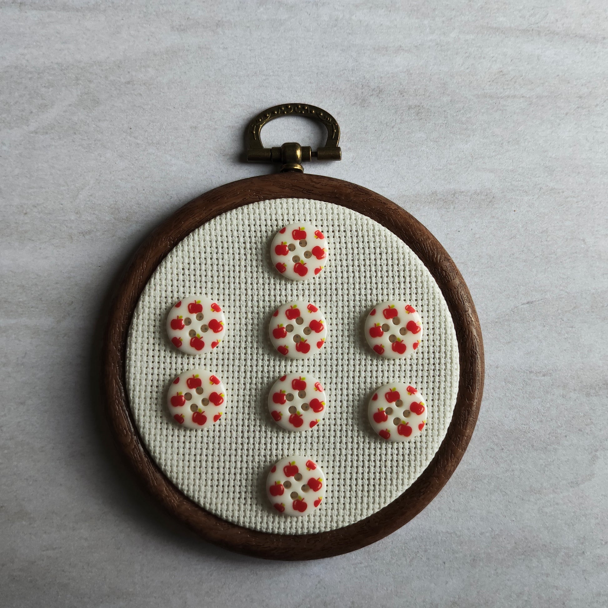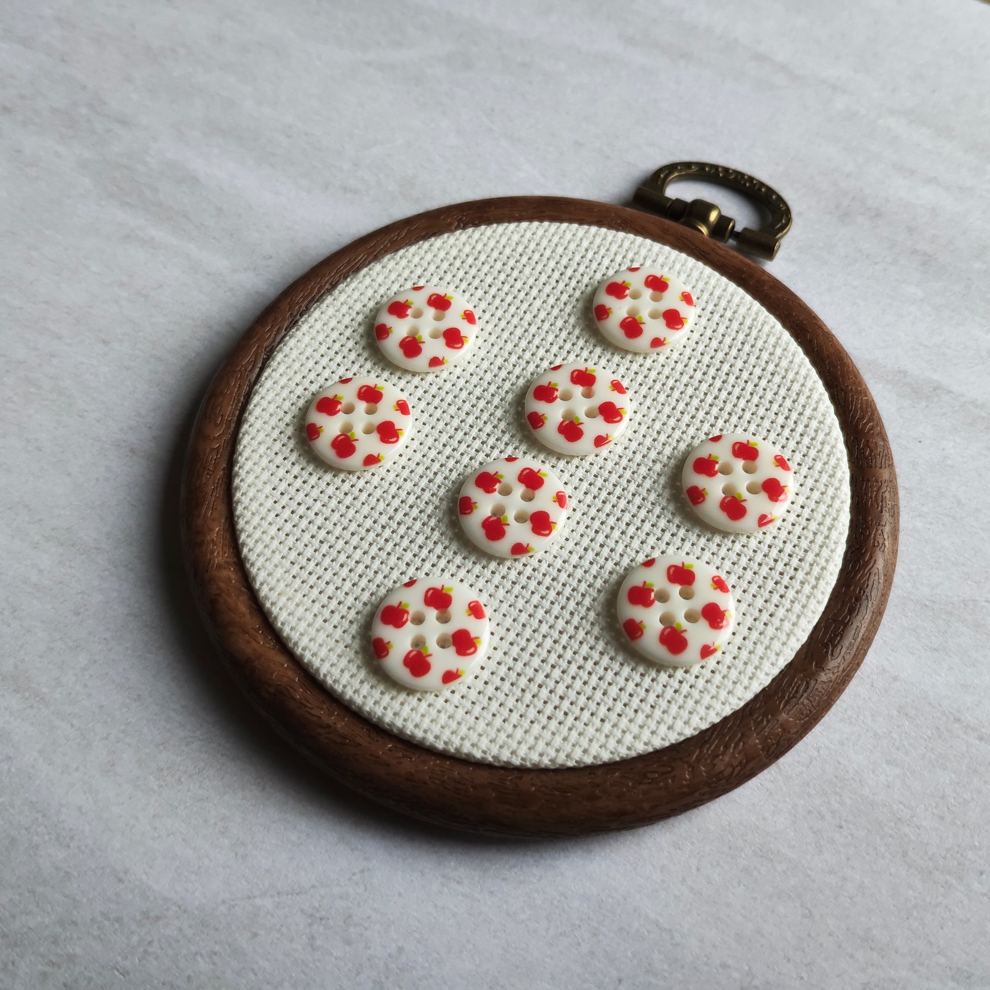 Boutons forme rond motif fruit pomme, couleurs rouge et blanc.