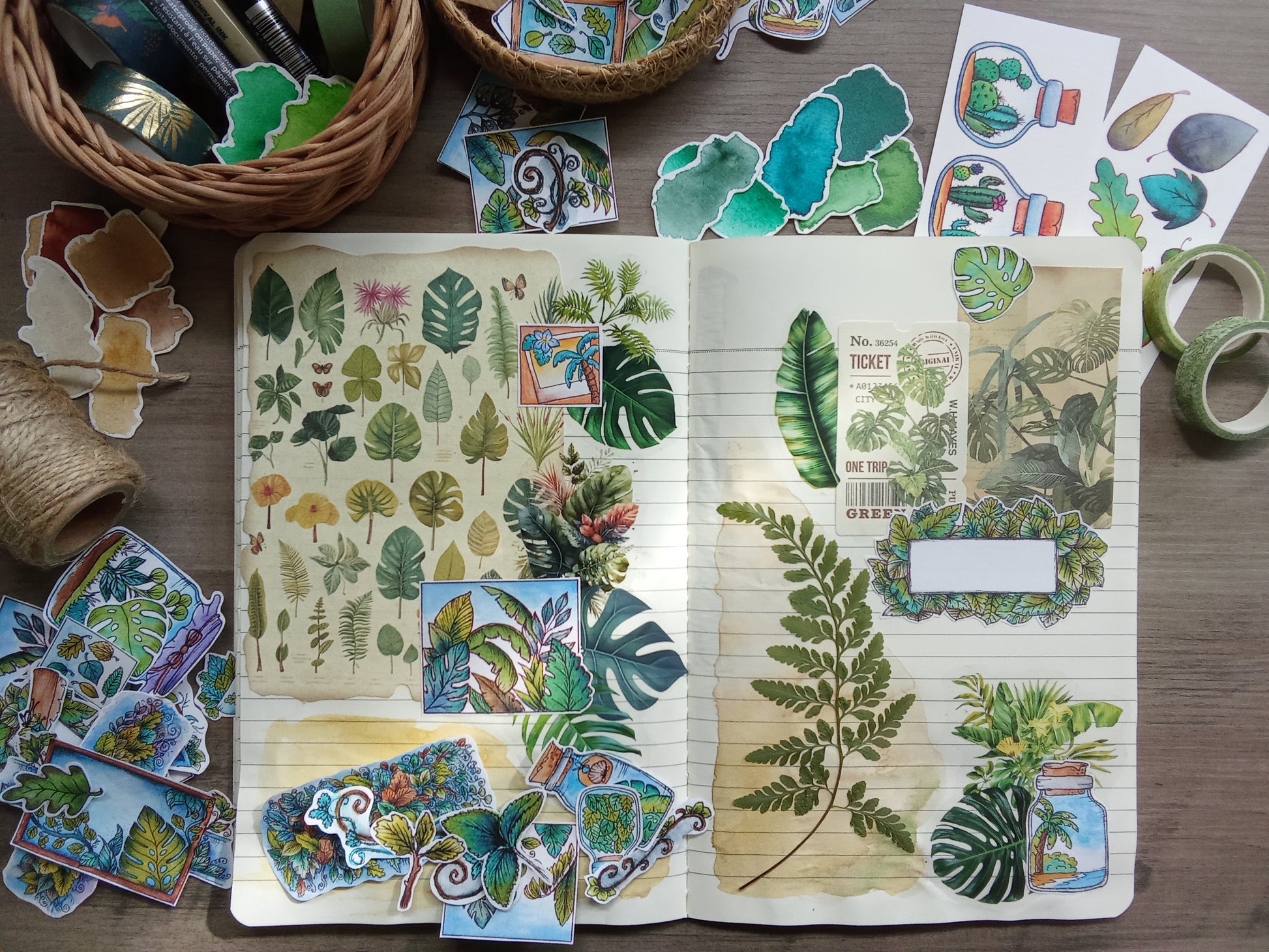 Ce lot de 44 stickers vous invite à explorer un monde végétal tout en douceur : feuilles exotiques, bocaux botaniques, plantes en pot, lianes, terrariums, cadres et petits détails feuillus… Toutes les illustrations sont réalisées à l’aquarelle, puis imprimées sur un papier mat fin, non repositionnable.