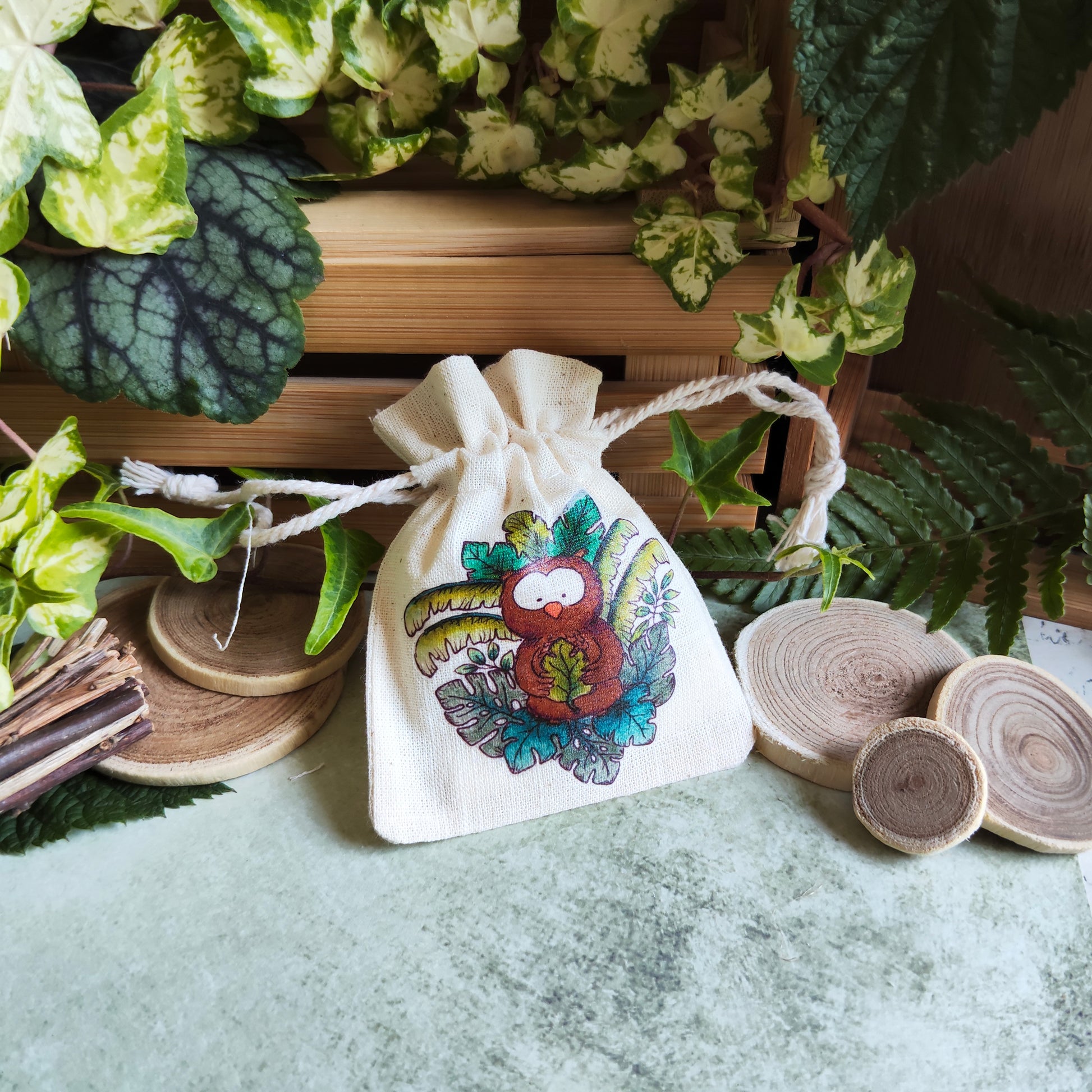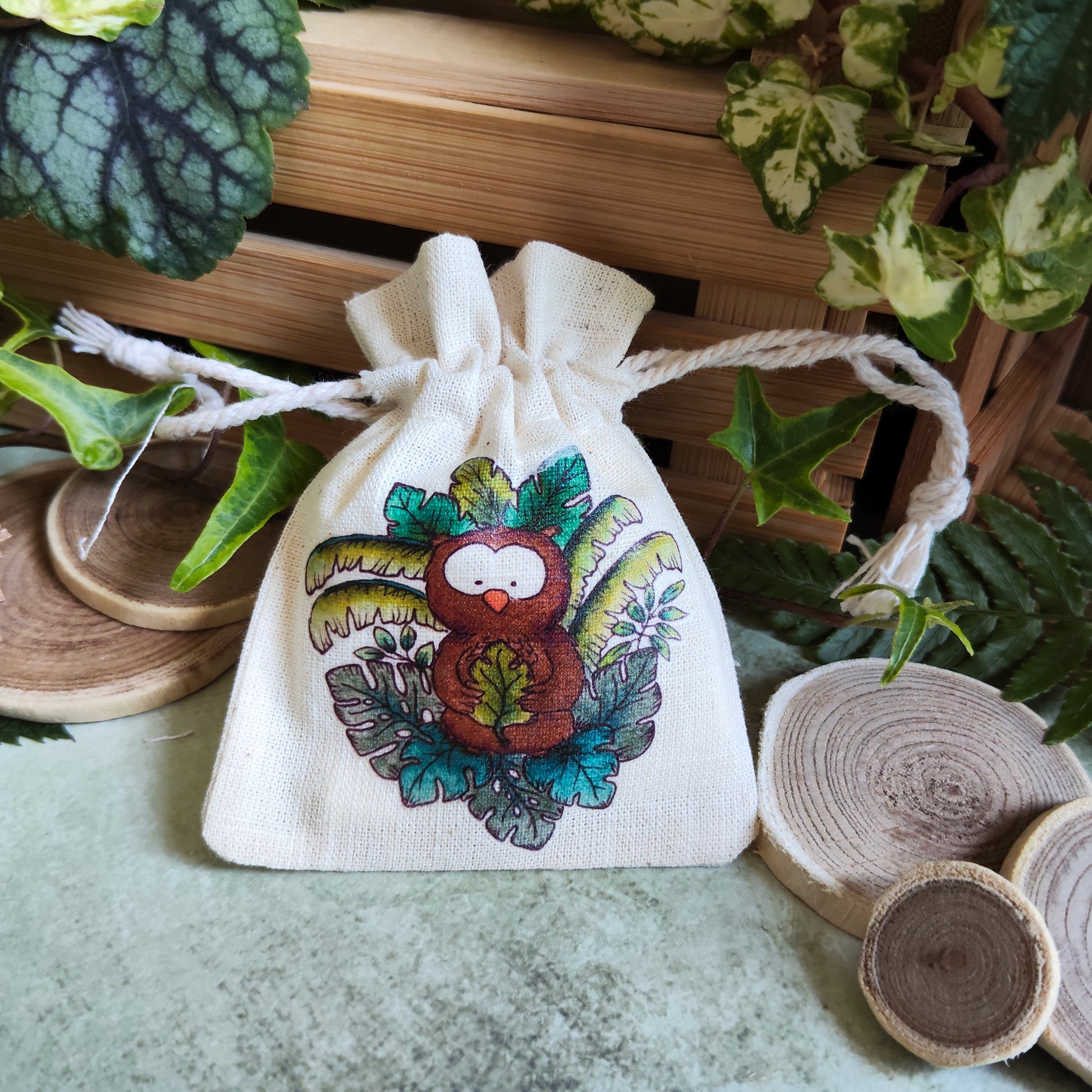 Ce pochon en coton met à l’honneur un hibou coloré entouré de feuillage tropical, peint à l’aquarelle. Parfait pour ranger vos petits trésors ou offrir un cadeau original inspiré de la nature exotique.