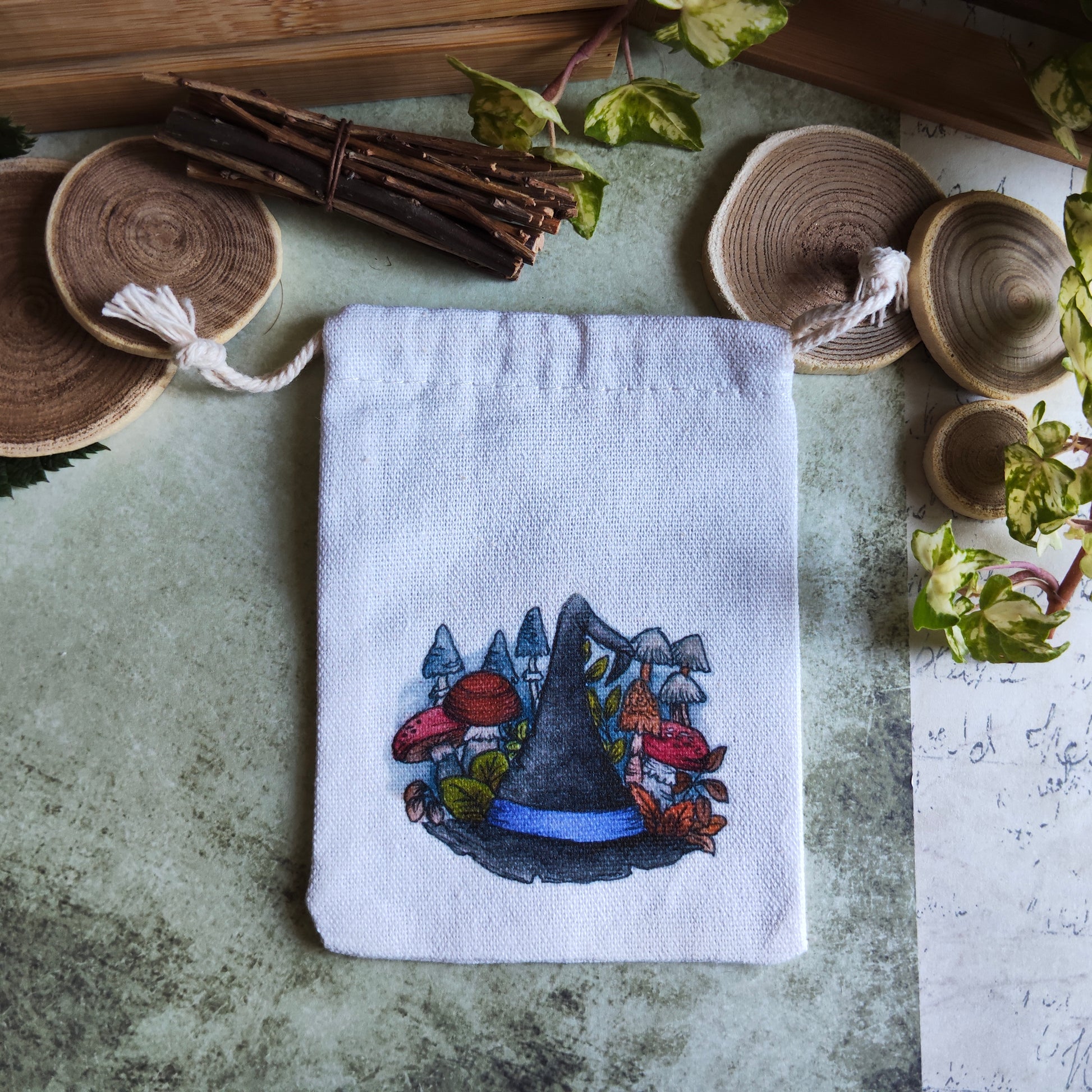 Un pochon en coton aux couleurs d’automne, décoré d’un chapeau de sorcière entouré de feuillage et citrouilles, peint à l’aquarelle. Parfait pour Halloween ou pour les amateurs d’univers enchantés.